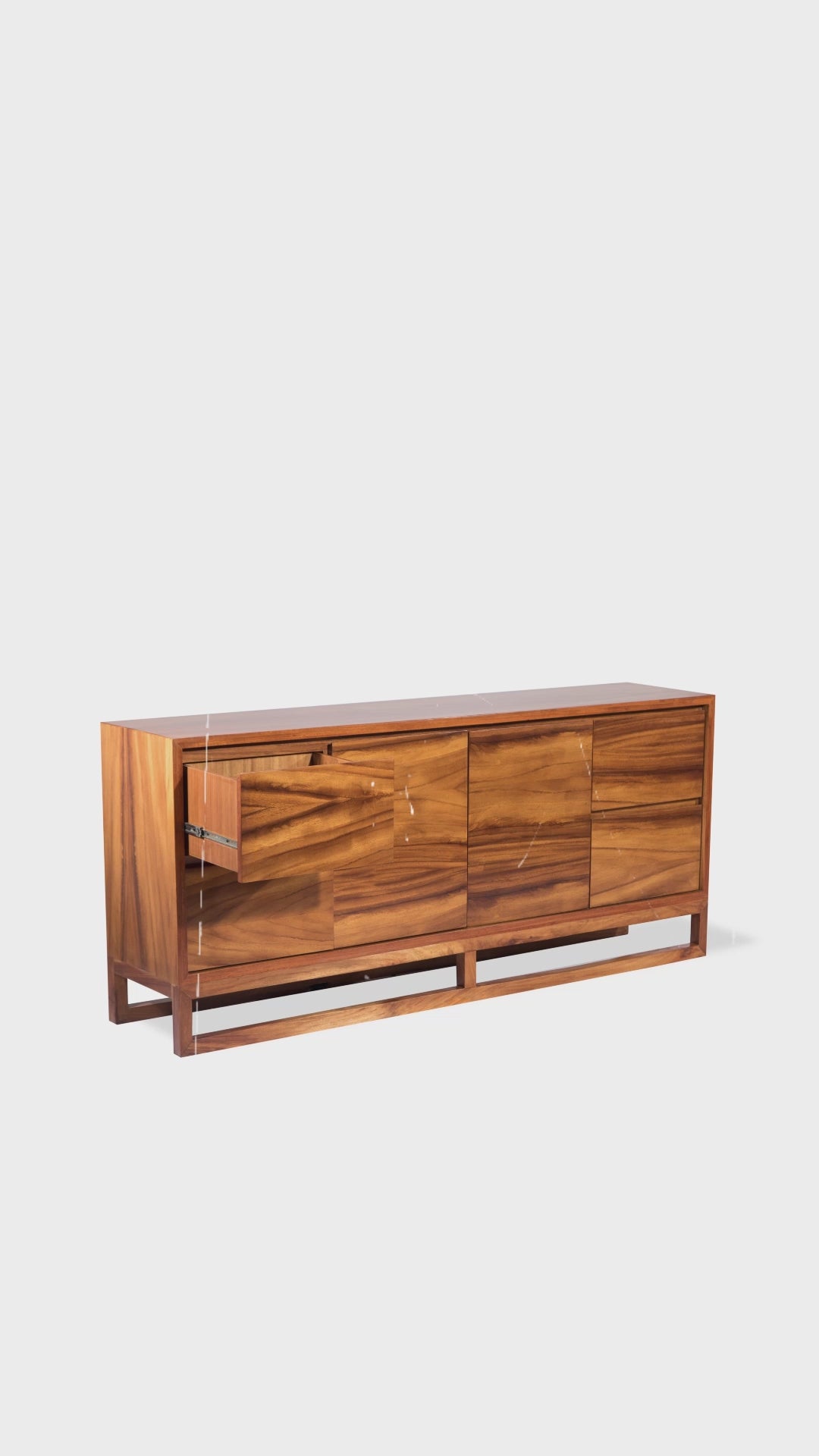 Descubre la elegancia y funcionalidad de nuestra Credenza Bruno. Con medidas generales de 1.80m de largo, 80cm de alto y 40cm de fondo, esta pieza está meticulosamente construida con pino premium estufado en el interior y chapa premium de parota en el exterior. Su acabado en poliuretano mate le confiere un aspecto sofisticado. Equipada con seis cajones y dos puertas con entrepaño, esta credenza combina belleza y practicidad a la perfección.